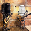 Ein cooles Metallmikrofon mit einem leuchtenden LED-Licht und einer Gitarre, die einen Cyberpunk-Look verleiht. Große Lampe für Büroarbeit, Studio und Garage Dekor zu. Der Roboter ist handgefertigt und hat einen Cyborg-Look.