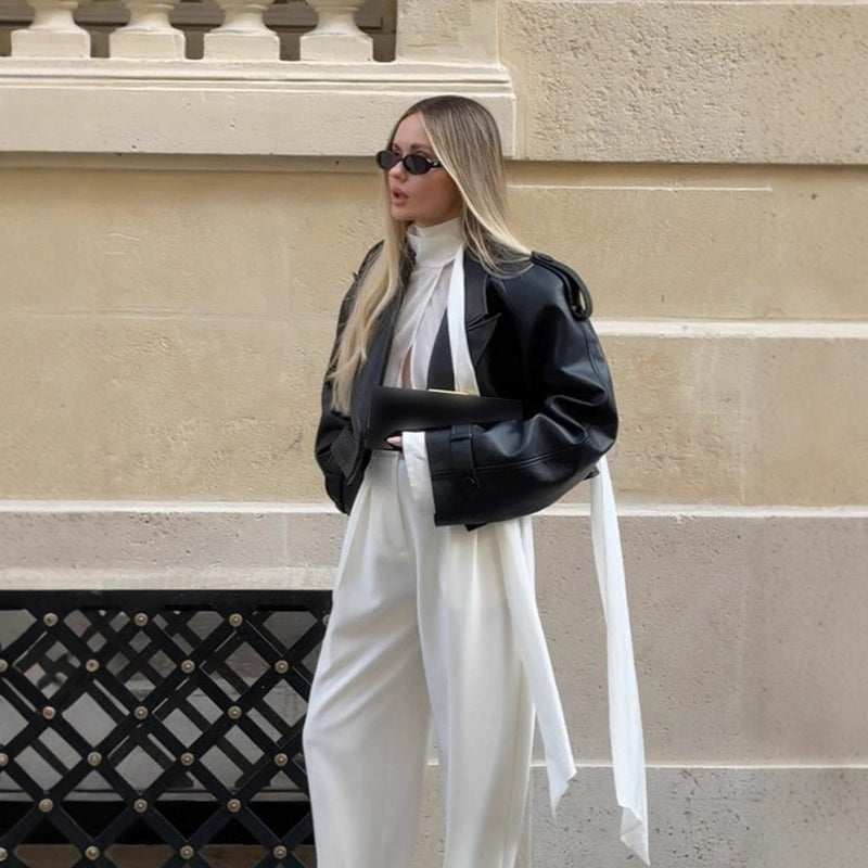 Unsere oversized Kunstlederjacke für Damen vereint Stil und Funktionalität. Mit ihrem markanten Kragen und den dekorativen Bändern ist sie ein wahrer Blickfang. Diese Jacke eignet sich perfekt für Frauen, die einen modernen, trendigen Look suchen und gleichzeitig praktische Details schätzen. Der lockere Schnitt sorgt für ausreichend Platz und Bewegungsfreiheit.