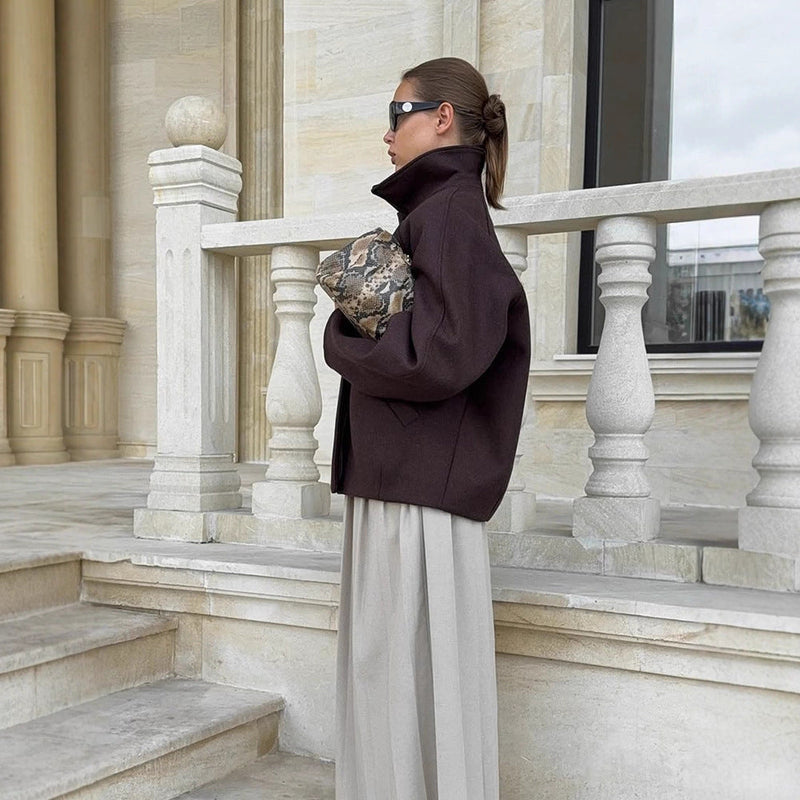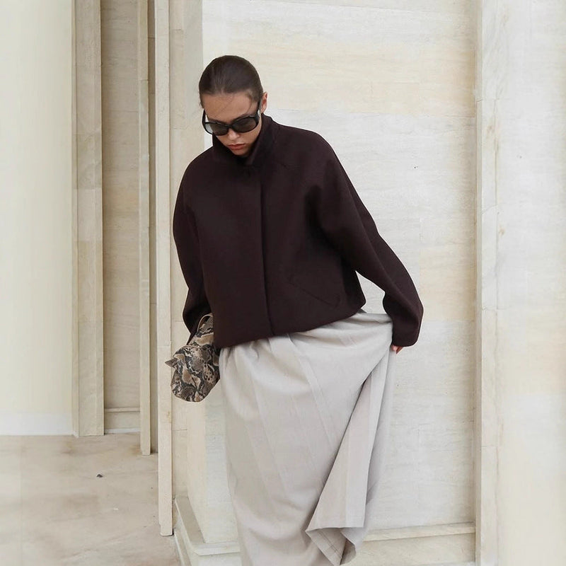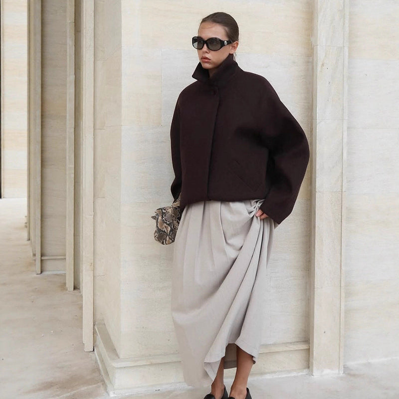Dieser Übergroße Wollmantel mit Stehkragen für Damen vereint zeitlose Form mit funktionaler Ausrichtung. Er ist für alle gedacht, die eine weite Passform und ein strukturiertes Material bevorzugen. Der Mantel bietet durch seinen langen Schnitt und den markanten Kragen eine klare Silhouette, die sich ideal für verschiedene Anlässe eignet.