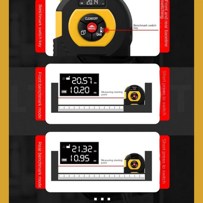 Sind Sie es leid, dass ungenaue Messungen Ihre Projekte verlangsamen? Hier ist die Lösung: das ProPrecision - 3-in-1 Infrarot-Laserbandmaß - Ihr ultimatives Werkzeug für präzise Messungen! Erhöhen Sie Ihr Messniveau mit diesem fortschrittlichen Gerät, das Infrarot-Lasertechnologie nahtlos mit der Bequemlichkeit eines traditionellen Maßbands kombiniert.