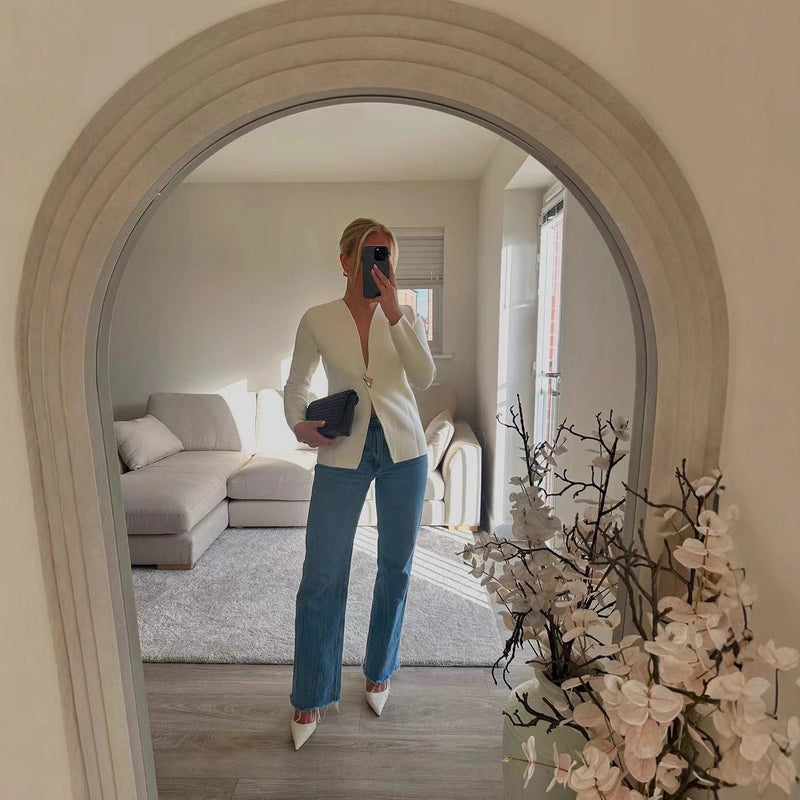 Funktionalität: Der V-Ausschnitt und der dekorative Knopf bieten eine ausgewogene Optik.