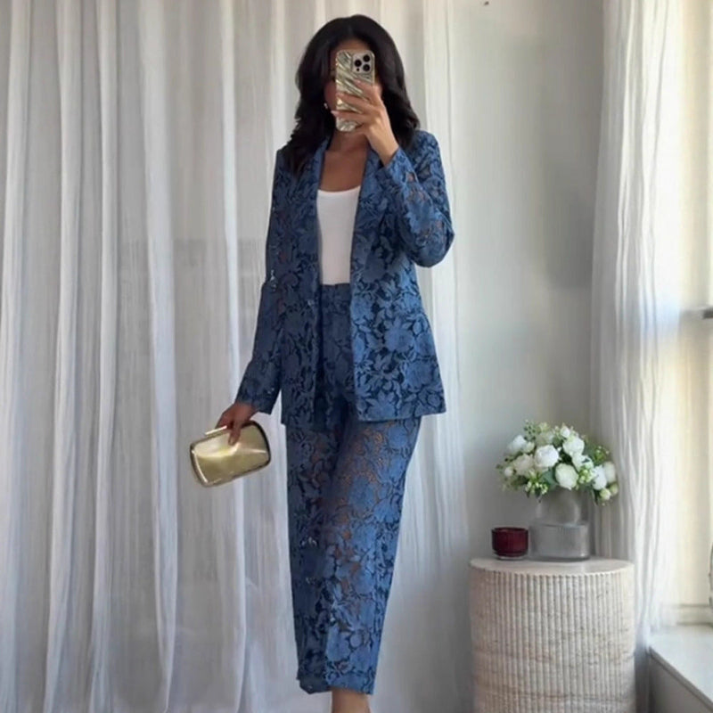 Dieses Spitzenanzug-Set für Damen kombiniert stilvolle Elemente mit modernen Details. Mit seiner feinen Spitzenapplikation und den femininen Akzenten ist es eine geeignete Wahl für festliche Veranstaltungen wie Hochzeiten oder Gartenpartys. Der Anzug ist sowohl für den besonderen Anlass als auch für den Alltag geeignet und bietet einen stimmigen Look.