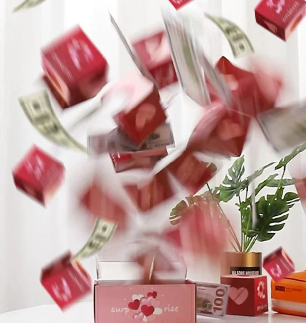 Entdecken Sie die zauberhafte Überraschungsbox, die Herzen zum Schmelzen bringt! Wenn Sie sie öffnen, entfesselt sie ein strahlendes Feuerwerk aus glitzernden Herzchen und sorgt so für einen magischen und unvergesslichen Moment.