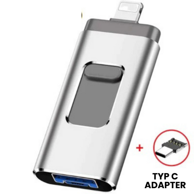 Dank seines 4-in-1-Designs ist GoTransfer™: mit jedem Gerät kompatibel. Egal, ob Sie einen USB-C-, USB-A- oder Micro-USB-Anschluss haben, Sie haben unbegrenzten Speicherplatz zur Hand.
