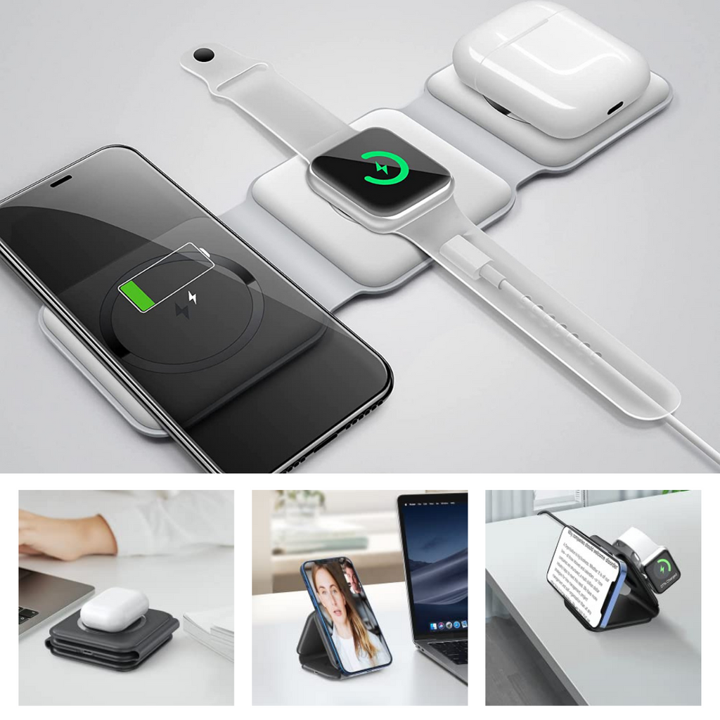 Sie werden nie wieder Geld für Ladekabel oder Adapter ausgeben müssen, denn das kabellose 3-in-1-Ladegerät ist die beste Lösung, um Ihr Smartphone, Ihre Uhr und Ihre Kopfhörer gleichzeitig aufzuladen. Du kannst sogar ein zweites Smartphone anstelle deiner Kopfhörer aufladen.