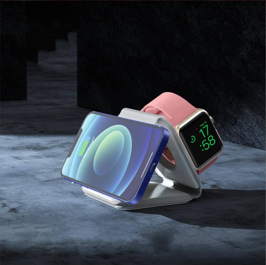 Eine Ladestation für zu Hause, im Büro und unterwegs: Sie werden nie wieder Geld für Ladekabel oder Adapter ausgeben müssen, denn das kabellose 3-in-1-Ladegerät ist die beste Lösung, um Ihr Smartphone, Ihre Uhr und Ihre Kopfhörer gleichzeitig aufzuladen. Du kannst sogar ein zweites Smartphone anstelle deiner Kopfhörer aufladen.