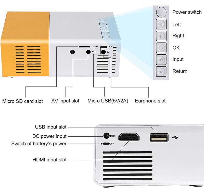 Dieses MiniTheater™ ist mit mehreren Anschlüssen für eine einfache Nutzung ausgestattet, einschließlich HDMI, USB, Micro SD-Karte, Audio- und AV-Schnittstelle. So kann es an iPhone, Android-Smartphones, Chromecast, Tablet, Ipad, Laptop, Macbook, Blu-ray-Player, DVD, Fire TV-Stick, Roku-Stick, TV-Box, Netflix Picture-Technologie, etc. angeschlossen werden.