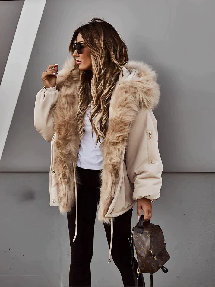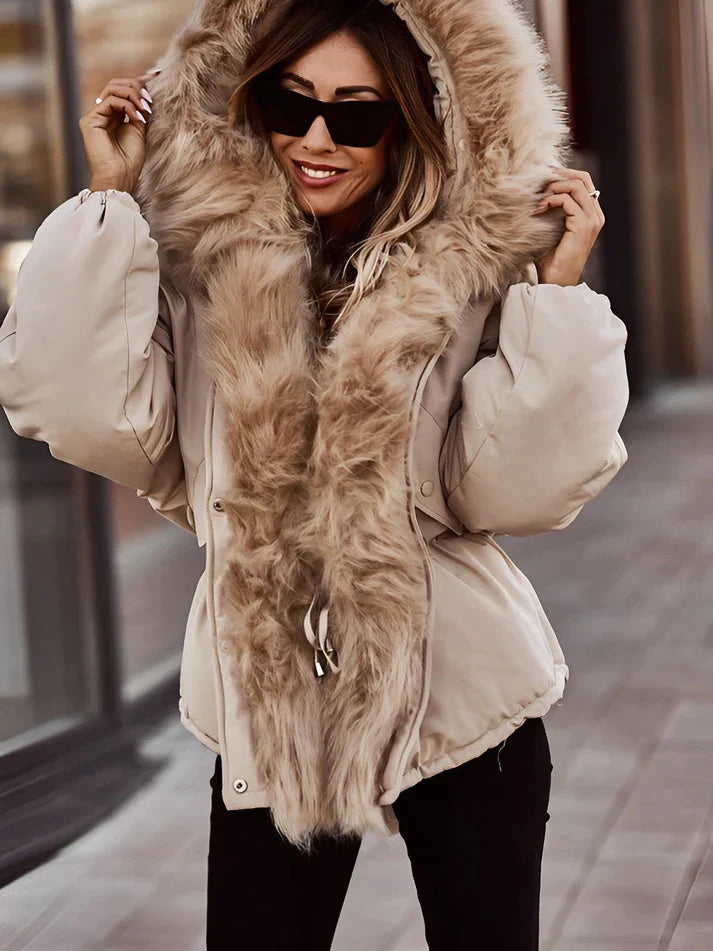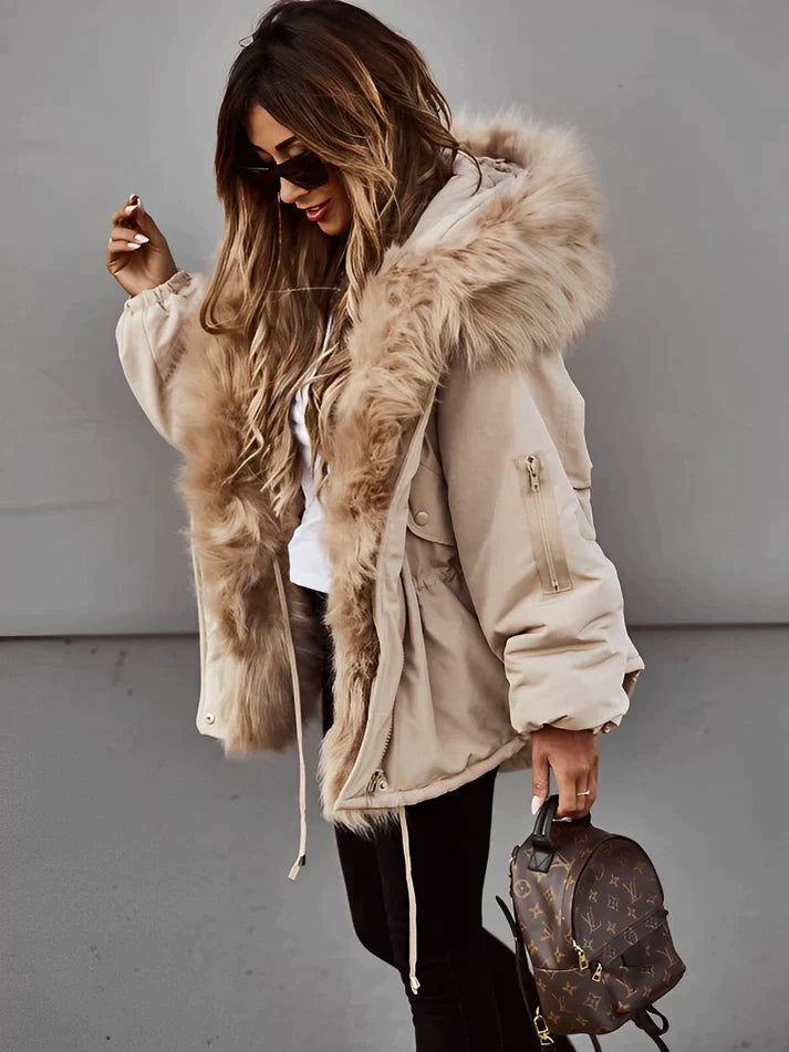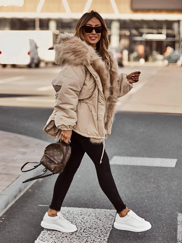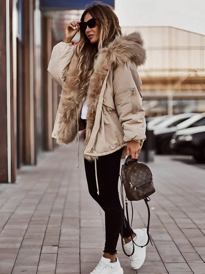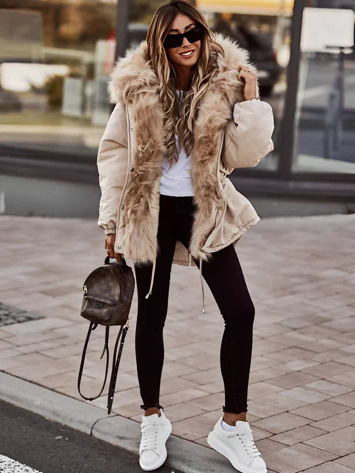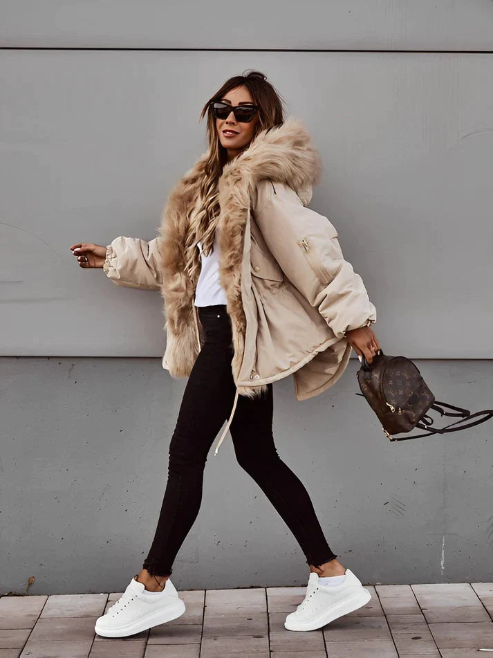 Lernen Sie Nadine kennen, den mit Kunstpelz gefütterten Wintermantel, der mühelos kuschelige Wärme mit schickem Stil verbindet.